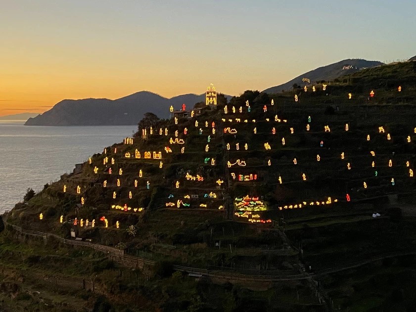 Partiamo presto in bus dai punti di partenza rilasciati in fase d’iscrizione per raggiungere con l’accompagnatore il golfo dei Poeti, sulla riviera ligure di Levante. A suggellare lo scenario di straordinaria bellezza del golfo, all’estremità occidentale, sorge Portovenere, autentico scrigno di storia, leggende e panorami. Qui ci attende la guida: entriamo attraverso la porta del Borgo, che si affaccia su piazza Bastreri, punto di partenza per scoprire il cuore medievale del paese. Tra botteghe, case di marinai e dettagli che raccontano la Liguria più autentica, si staglia la ‘palazzata a mare’, una cortina di case-torri color pastello, costruite nei secoli per difendere Portovenere dagli attacchi dei pirati. Raggiungiamo con pochi passi la chiesa di San Lorenzo, conosciuta come santuario della Madonna Bianca. Poco oltre si erge San Pietro, simbolo indiscusso del borgo: arroccata a picco sugli scogli, appare come una sentinella sul mare aperto. In inverno, con le onde che si infrangono e il vento che soffia tra le sue arcate, l’atmosfera diventa suggestiva e intensa. Qui il Natale si vive in un modo diverso, più raccolto: le facciate color pastello sembrano già un presepe. È un Natale intimo e poetico, che nasce dal silenzio del golfo d’inverno, dalla luce livida che si riflette sulle vie acciottolate, dall’aria che profuma di salsedine. Dopo il tempo libero per il pranzo, avvolti dai profumi di focaccia e pesto, il nostro itinerario prosegue verso Manarola, forse la più affascinante delle Cinque Terre. Al calar della sera, assistiamo a uno spettacolo unico: si accende il presepe luminoso più grande del mondo. Oltre 300 figure, realizzate con materiale di recupero, illuminano il pendio della collina trasformandola in un’immensa natività sospesa tra mare e cielo. Un’opera di straordinaria creatività che unisce spiritualità, tradizione e sostenibilità, capace di emozionare con la forza semplice della luce. In tempo utile ci riaccomodiamo in bus per raggiungere le nostre località di partenza.